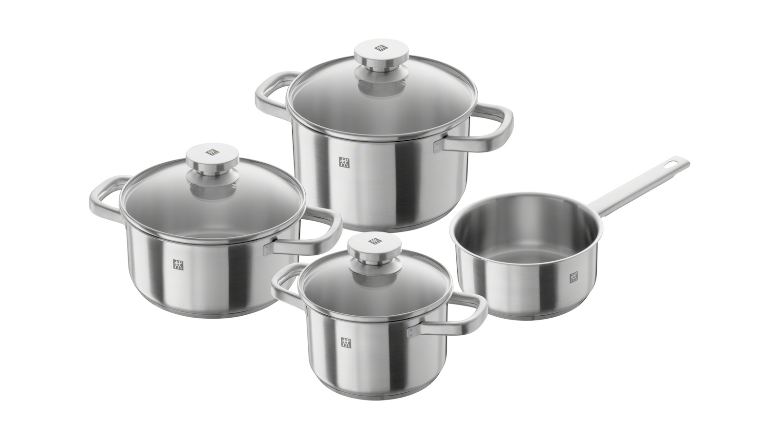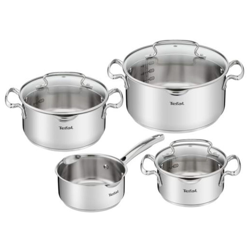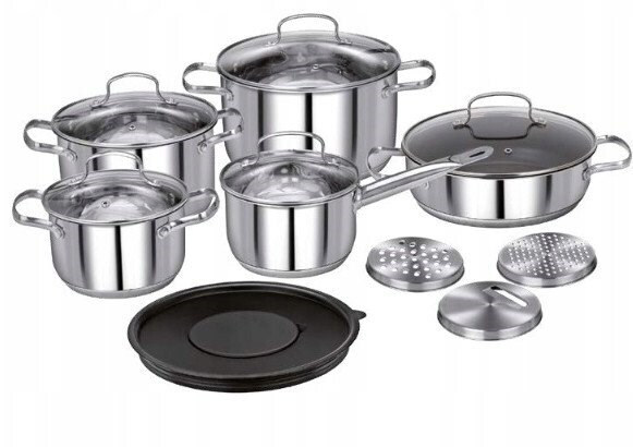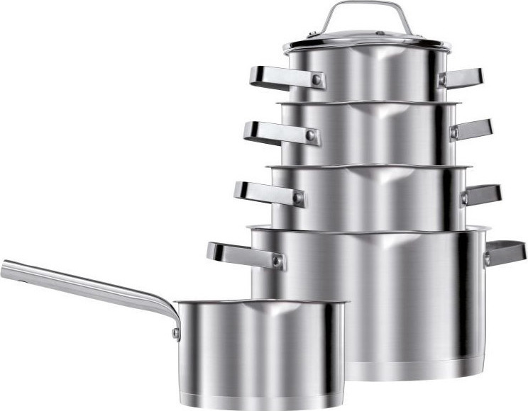 Σετ μαγειρικών σκευών κατασκευασμένα από ανοξείδωτο ατσάλι. Διαθέτουν πολυστρωματικό και πυκνό πάτο, ο οποίος κατανέμει ομοιόμορφα τη θερμότητα και εσωτερική κλίμακα