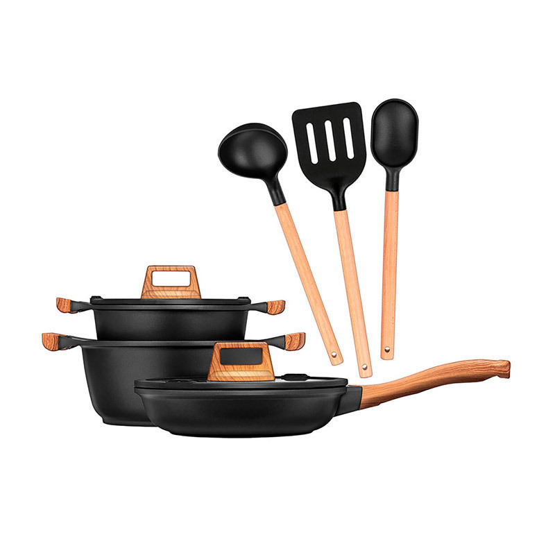 Το σετ τηγανιών και κατσαρόλων περιλαμβάνει τα εξής χαρακτηριστικά: Χρώμα λαβής: Ξύλο Κατάλληλο για τύπους εστιών: Ηλεκτρικές Αντικολλητική επίστρωση: Ναι