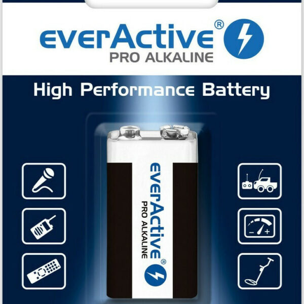 Αλκαλική μπαταρία τύπου “9V” μίας χρήσης της εταιρίας everActive, κατάλληλη για φακούς και άλλες οικιακές μικροσυσκευές που χρησιμοποιούν 9V μπαταρίες.