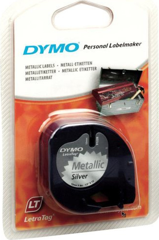 Αυτοκόλλητη μεταλλική ταινία ετικετογράφου Letratag σε κασέτα. Ανθεκτικές στο σκίσιμο ετικέτες για εσωτερική χρήση. Δημιουργημένες ειδικά για τον εκτυπωτή ετικετών
