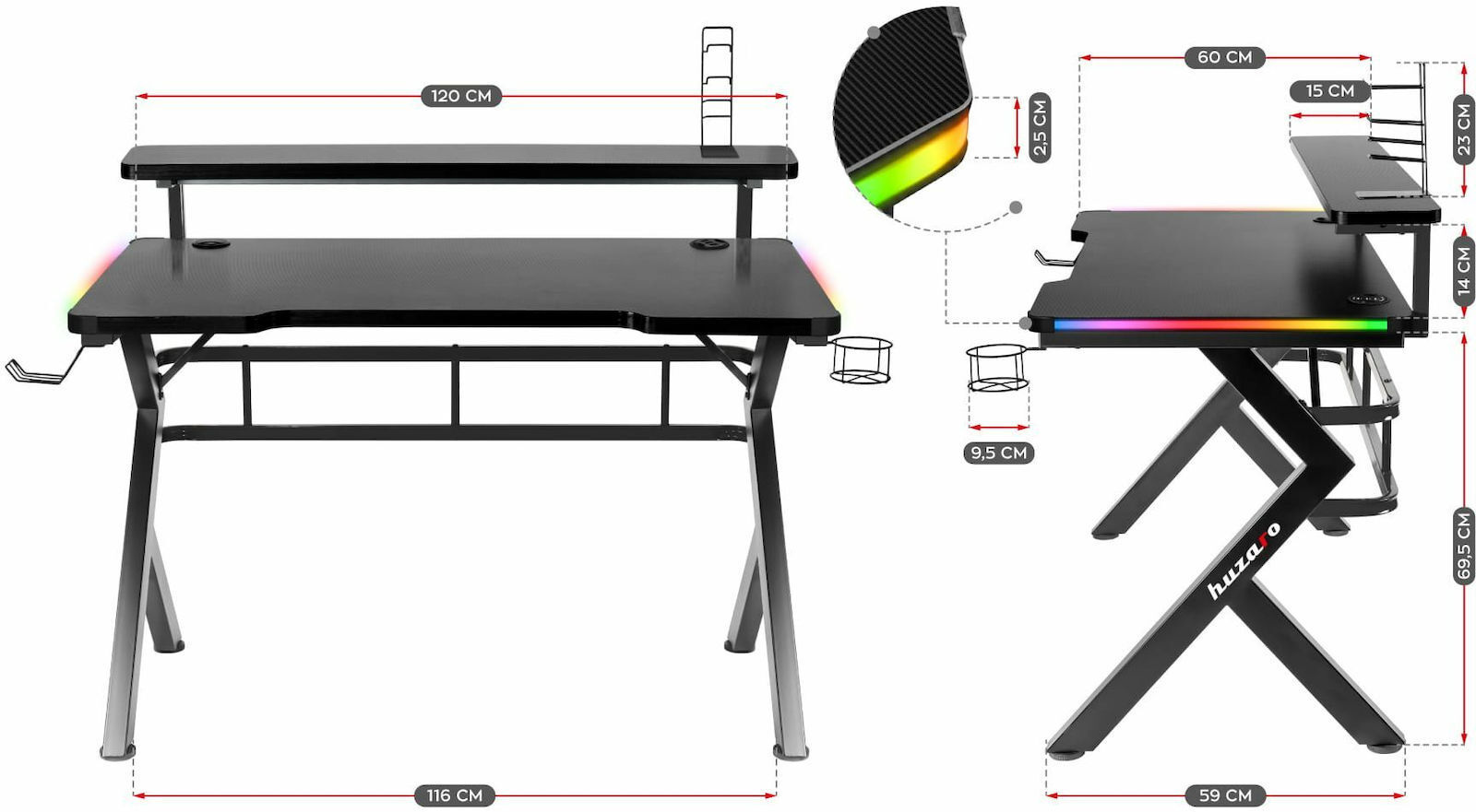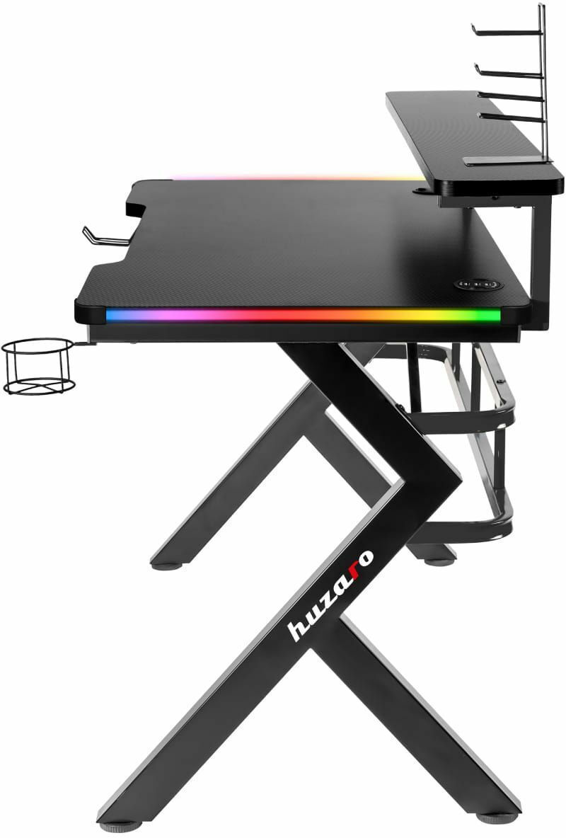 Το γραφείο gaming της εταιρείας Huzaro διαθέτει μεταλλικά πόδια και επιφάνεια από MDF (ινοσανίδα), ένα παράγωγο ξύλου από κομμάτια, ίνες και υπολείμματα ξύλου. Η επένδυση της επιφάνειας του γραφείου είναι με carbon fiber (ανθρακόνημα) το οποίο αποτελείται από λεπτά, ισχυρά κρυσταλλικά νημάτια άνθρακα που προσφέρουν υψηλή αντοχή στα γρατζουνίσματα και την υψηλή θερμότητα. Διαθέτει εργονομικό σχεδιασμό με στόχο να προσφέρει στον χρήστη μια ξεχωριστή εμπειρία gaming.