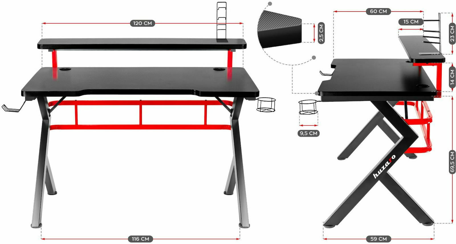 Το γραφείο gaming της εταιρείας Huzaro διαθέτει μεταλλικά πόδια και επιφάνεια από MDF (ινοσανίδα), ένα παράγωγο ξύλου από κομμάτια, ίνες και υπολείμματα ξύλου. Η επένδυση της επιφάνειας του γραφείου είναι με carbon fiber (ανθρακόνημα) το οποίο αποτελείται από λεπτά, ισχυρά κρυσταλλικά νημάτια άνθρακα που προσφέρουν υψηλή αντοχή στα γρατζουνίσματα και την υψηλή θερμότητα. Διαθέτει εργονομικό σχεδιασμό με στόχο να προσφέρει στον χρήστη μια ξεχωριστή εμπειρία gaming.