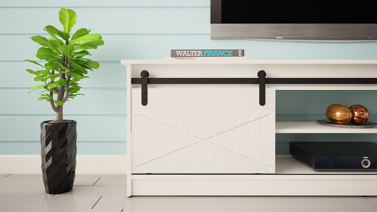 Το λευκό χρώμα και η γυαλιστερή φινίρισή του προσφέρουν μια σύγχρονη αίσθηση, ιδανική για κάθε σαλόνι. Το έπιπλο είναι εξοπλισμένο με ρόδες για εύκολη μετακίνηση και διαθέτει συρτάρια για αποθήκευση, επιτρέποντάς σας να διατηρείτε τον χώρο σας τακτοποιημένο.