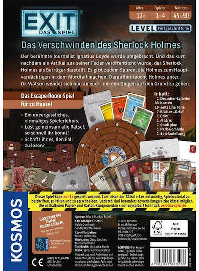 Εξερευνήστε τον κόσμο του μυστηρίου με το παιχνίδι EXIT – Das Spiel: Das Verschwinden des Sherlock Holmes. Ένα συνεργατικό παιχνίδι γρίφων που προκαλεί την ομάδα σας να συνεργαστεί για να λύσει το μυστήριο γύρω από την περίφημη εξαφάνιση του διάσημου ντετέκτιβ.