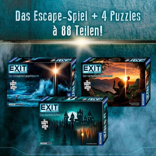 Στο EXIT – Das Dunkle Schloss, οι παίκτες καλούνται να συνεργαστούν για να λύσουν γρίφους και να αποδράσουν από το σκοτεινό κάστρο πριν από την εκπνοή του χρόνου. Με την πολύπλοκη πλοκή του και τους έξυπνους γρίφους, το παιχνίδι προσφέρει μια μοναδική εμπειρία που συνδυάζει λογική, παρατηρητικότητα και συνεργασία.