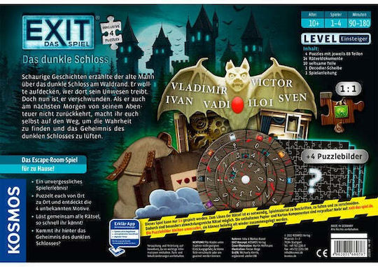 Ανακαλύψτε το EXIT – Das Dunkle Schloss, ένα συναρπαστικό παιχνίδι επιτραπέζιου τύπου Escape Room που θα σας μεταφέρει σε ένα μυστήριο γεμάτο προκλήσεις και γρίφους. Ιδανικό για οικογενειακές βραδιές ή συγκεντρώσεις με φίλους, αυτό το παιχνίδι εγγυάται ώρες διασκέδασης!