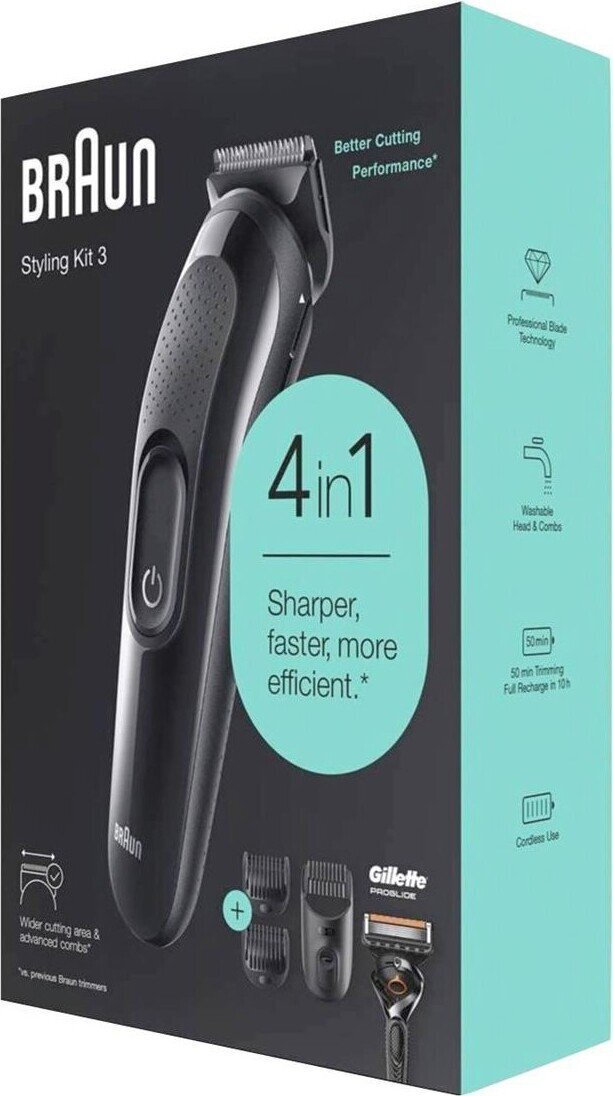 Η επαναφορτιζόμενη κουρευτική μηχανή Braun 4 σε 1 SK3300 είναι ένα πολυλειτουργικό εργαλείο περιποίησης, σχεδιασμένο για ολοκληρωμένη φροντίδα των μαλλιών, του προσώπου και του σώματος.