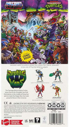 Φιγούρα Δράσης Leonardo από το Masters of the Universe. Το μέγεθος της φιγούρας είναι περίπου 14 εκ. και διαθέτει αρθρωτά μέρη. Αυτή η φιγούρα Turtles of Grayskull απεικονίζει την εντυπωσιακή ένωση των κόσμων των Ninja Turtles και Masters of the Universe, καθώς συγκρούονται στους Πολέμους των Ερπετών. Οι Ninja Turtles περιπλανώνται στην Eternia αναζητώντας τον Shredder, αλλά εμπλέκονται στο σχέδιο του King Hiss να καταστήσει τους Snake Men τη πιο ισχυρή δύναμη στο σύμπαν.