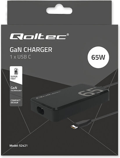 Φορτιστής 65w Gan Super Fast Slim Pd 5-20v 3.25a Usb-c 3.1 Laptop Macbook Smartphone Qoltec