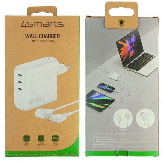 4Smarts Φορτιστής Χωρίς Καλώδιο με 3 Θύρες USB-C 140W Λευκός (GaN Flex Pro)