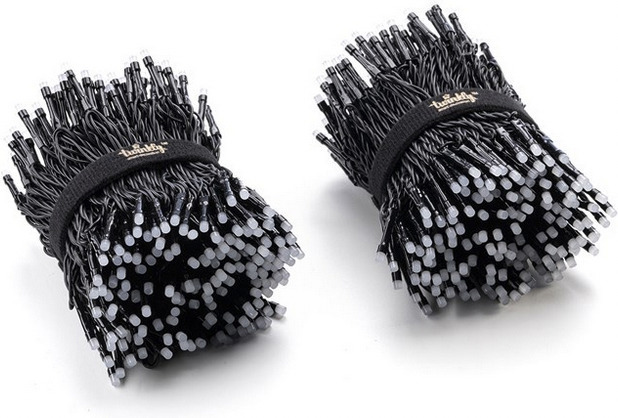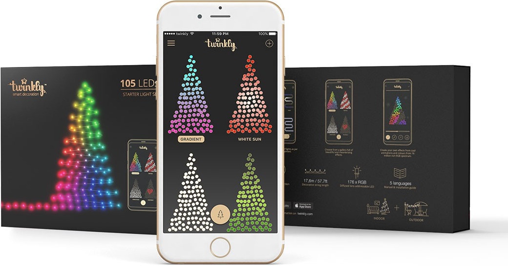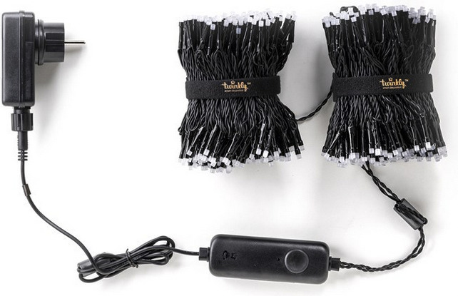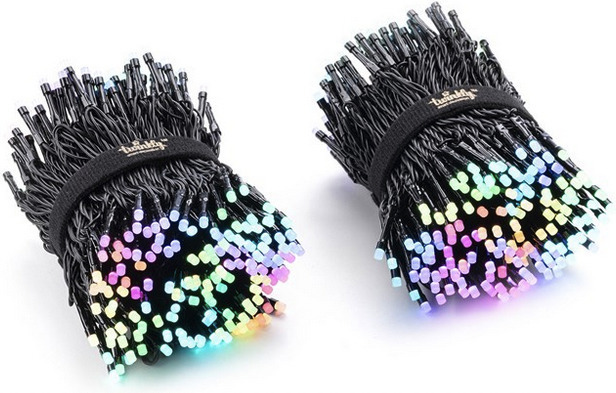 Χριστουγεννιάτικα λαμπάκια σειρά της Twinkly μήκους 48m, με 600 λαμπάκια led. Εκπέμπουν φως σε διάφορα χρώματα χρώμα και έχουν μαύρο καλώδιο. Διαθέτουν βαθμό προστασίας IP44, που δηλώνει ότι δεν μπορούν να εισχωρήσουν στερεά αντικείμενα άνω του ενός χιλιοστού αλλά ούτε και νερό με μεγάλη ένταση. Λειτουργούν με ρεύμα.