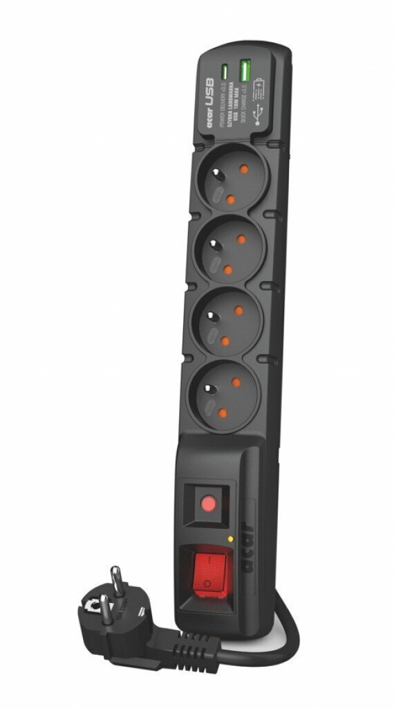 Η πολύπριζα Acar F4 USB A+C W2441 είναι μια σύγχρονη λύση που προστατεύει έως και τέσσερις συσκευές ταυτόχρονα. Διαθέτει ενσωματωμένη γρήγορη φόρτιση με συνολική ισχύ 18W, υποστηρίζοντας τα πρωτόκολλα φόρτισης Quick Charge 3.0 (θύρα USB-A) και Power Delivery 3.0 (θύρα USB-C).
