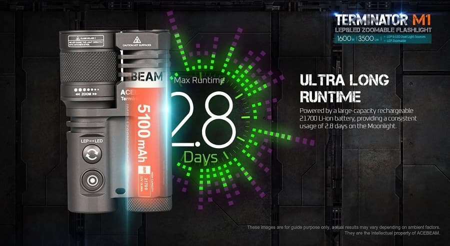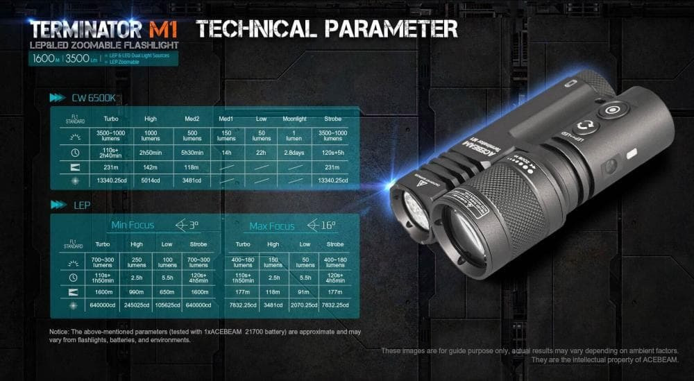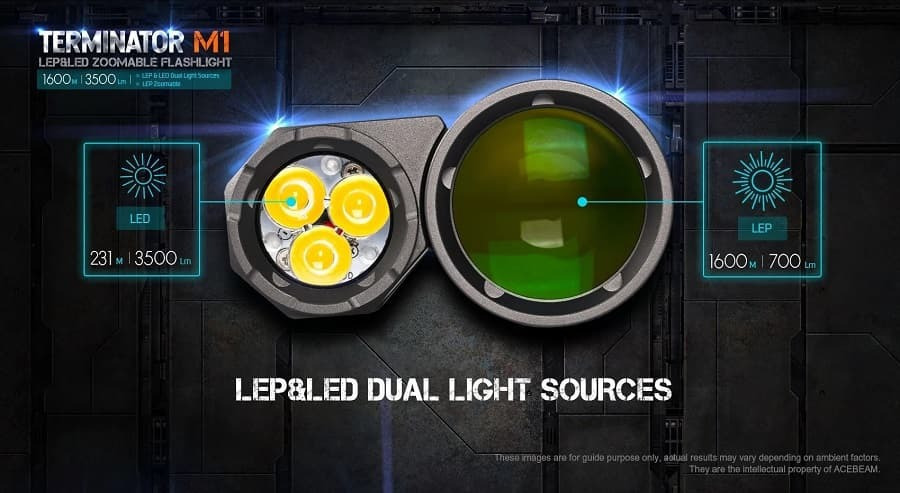 Ο Terminator M1 συνδυάζει το στοιχείο LEP με LED τεχνολογίες. Η μονάδα LEP παράγει φωτεινή δέσμη με δυνατότητα μεγέθυνσης έως και 1600 μέτρα. Η εναλλαγή μεταξύ Spotlight και Floodlight γίνεται εύκολα με διακόπτη.