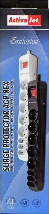 Πολύπριζο ActiveJet με καλώδιο 1,5 m. Είναι απαραίτητο στοιχείο που προστατεύει από υπερτάσεις και παρεμβολές στο δίκτυο τροφοδοσίας. Διαθέτει σύστημα προστασίας δύο σταδίων και 8 πρίζες με γείωση, αυτόματη ασφάλεια, ασφαλές, άφλεκτο και μη αγώγιμο περίβλημα, ένδειξη λειτουργίας και αντικαταστάσιμη ασφάλεια. Η λωρίδα μπορεί να στερεωθεί στο έδαφος.