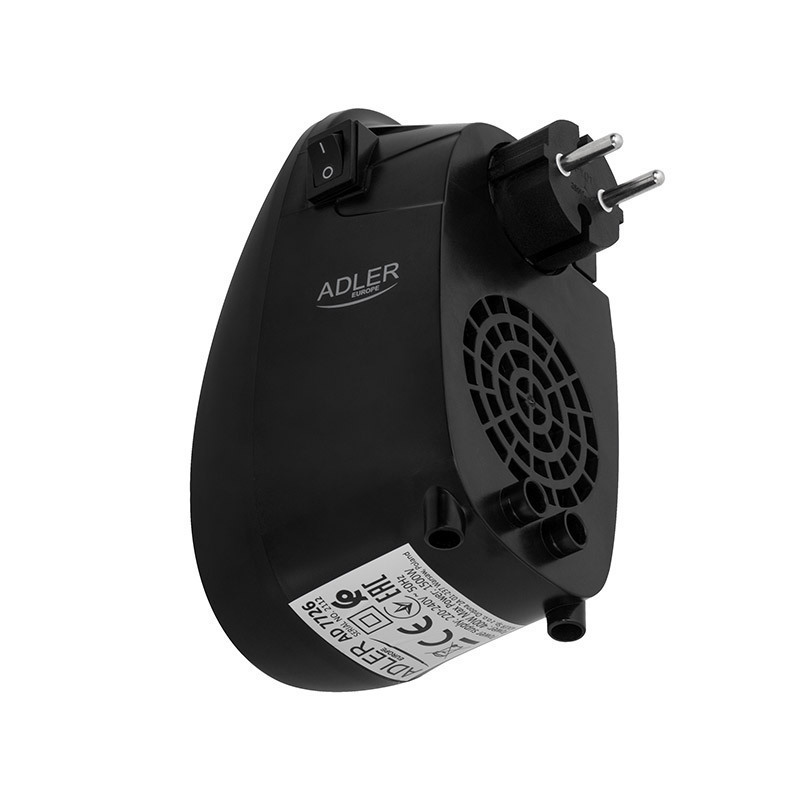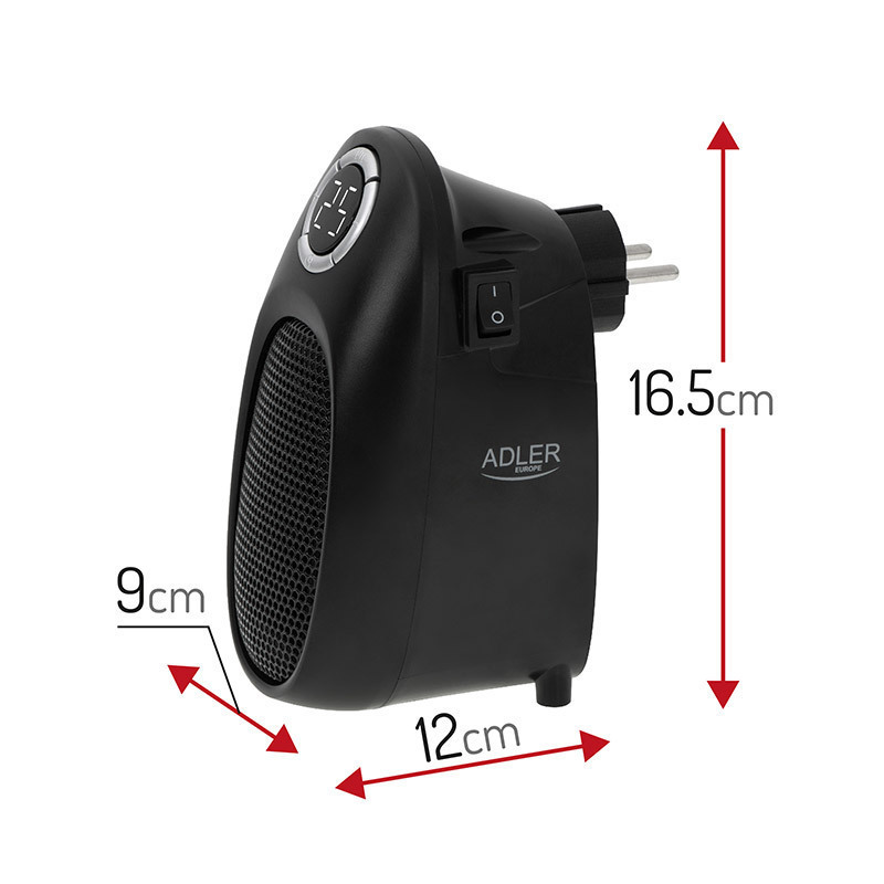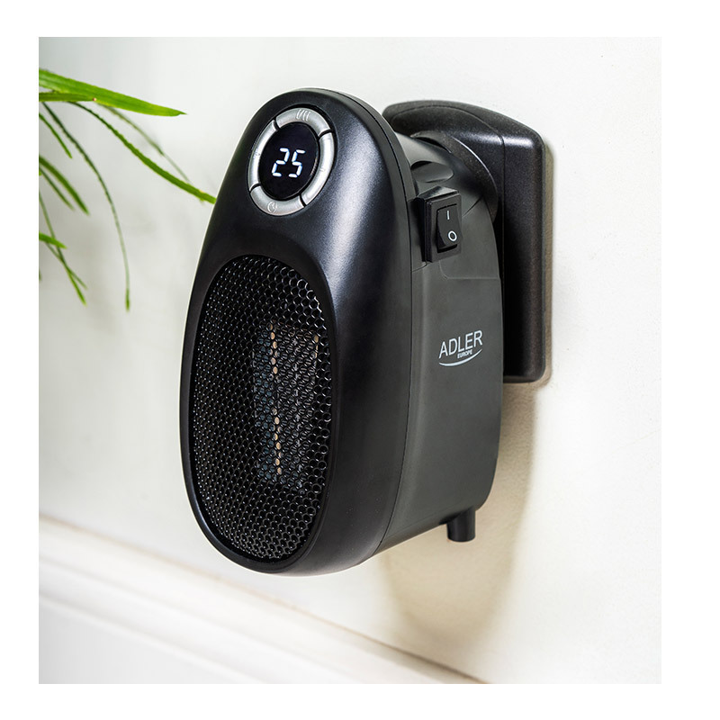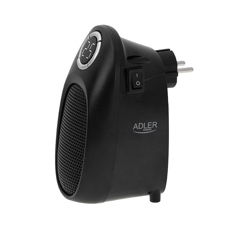 Το mini αερόθερμο πρίζας από την εταιρία Adler έχει ισχύ 1500 W και μπορεί να θερμάνει ένα δωμάτιο με επιφάνεια δαπέδου 32 m². Διαθέτει χρονοδιακόπτη με καθυστέρηση απενεργοποίησης έως και 12 ώρες και επιλογή ελέγχου θερμοκρασίας μεταξύ 15 και 35 °C με καθαρή λευκή οθόνη LED.