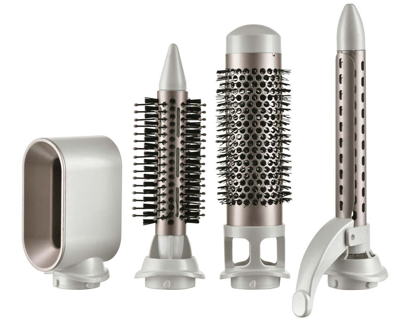 Ηλεκτρική Βούρτσα Μαλλιών σε απόχρωση Πέρλα. Αυτή η συσκευή συνδυάζει τις λειτουργίες πιστολάκι και τυλίγματος μαλλιών.
