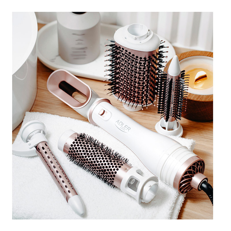 • 5 εξαρτήματα: Περιλαμβάνει δύο στρογγυλές βούρτσες 21mm και 38mm, μια μεγάλη βούρτσα 72mm, ένα για μπούκλες 19mm και ένα εξάρτημα για στέγνωμα.