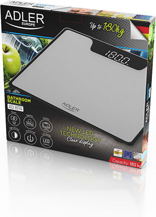 Η ζυγαριά μπάνιου ADLER AD8174s διαθέτει επιφάνεια από σκληρυμένο γυαλί 6 χιλιοστών και παρέχει χωρητικότητα φορτίου έως 180 κιλά. Η ακρίβεια της μέτρησης διασφαλίζεται από 4 μετρητές καταπόνησης.