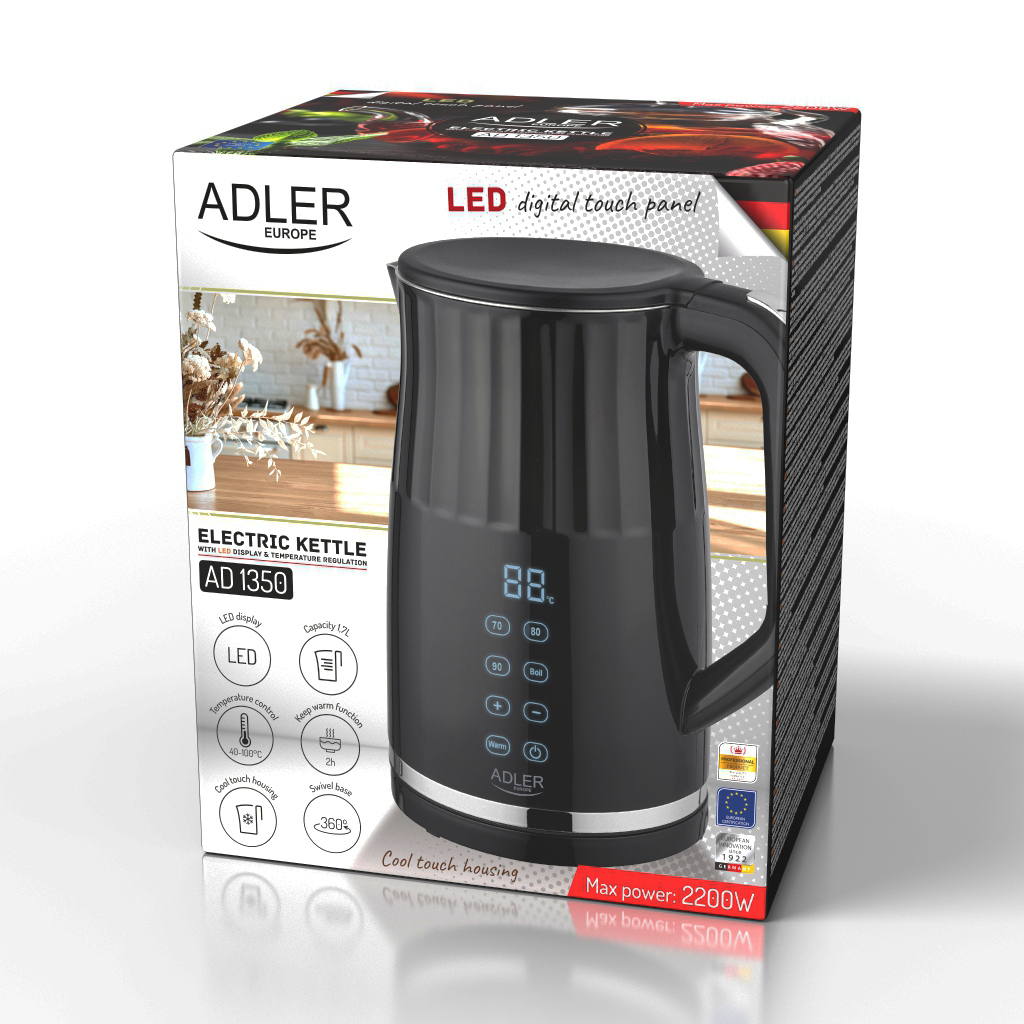 Βραστήρας ADLER LED ηλεκτρικός με έλεγχο θερμοκρασίας χωρητικότητας 1.7L σε μαύρο χρώμα.