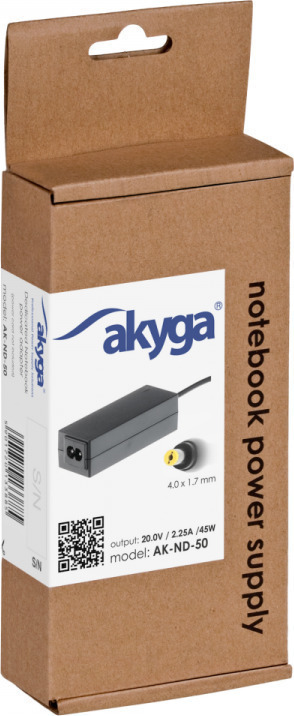 Το AK-ND-50 είναι ένα τροφοδοτικό για φορητούς υπολογιστές, για συσκευές που τροφοδοτούνται με 20V / 2,25A, ισχύ 45W και βύσμα 4,0 * 1,7 mm. Το καλώδιο του μετασχηματιστή είναι εξοπλισμένο με πυρήνα φερρίτη υψηλής ποιότητας που αποτρέπει και προστατεύει τις συσκευές από τυχόν πιθανά ρεύματα λειτουργίας και θόρυβο υψηλής συχνότητας.