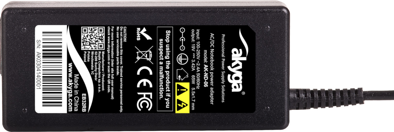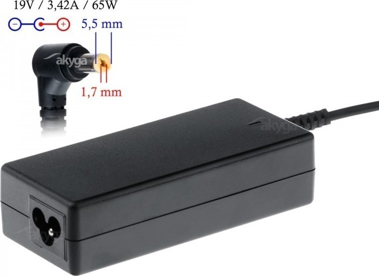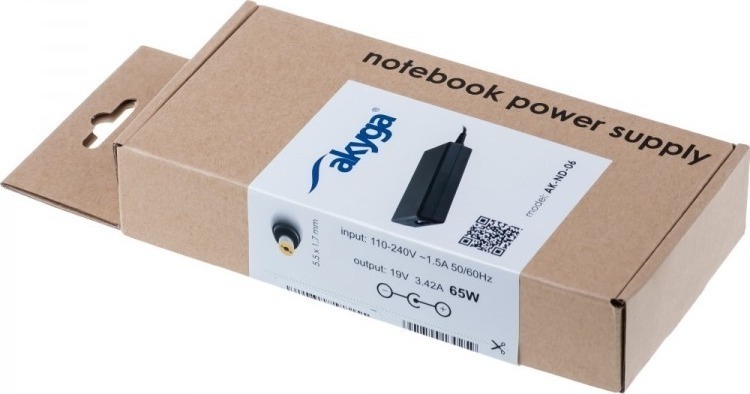 Το Akyga AK-ND-06 είναι ένα ειδικό τροφοδοτικό για φορητούς υπολογιστές και για συσκευές που τροφοδοτούνται με 19V/3,42A , ισχύ 65W και βύσμα 5,5* 1,7 mm .