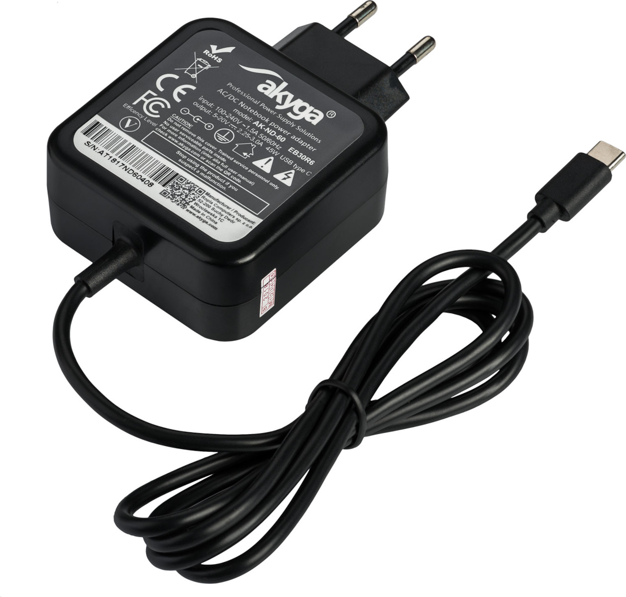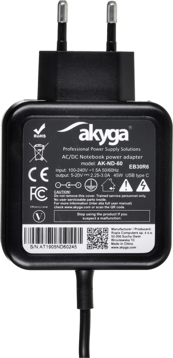 Akyga USB-C Universal Φορτιστής Laptop 45W 20V 3A με Αντάπτορα Τροφοδοσίας