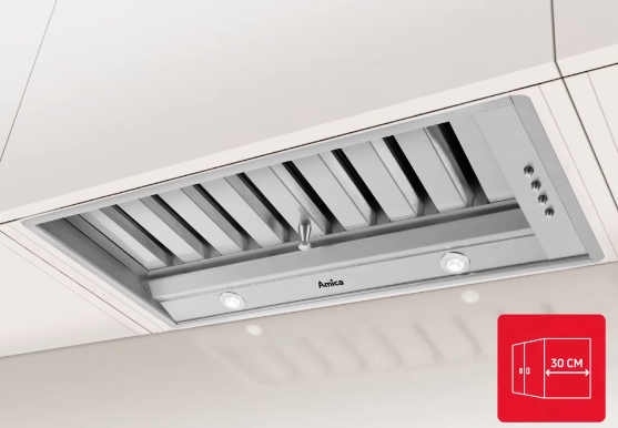 Τώρα, χάρη στο μειωμένο βάθος κατασκευής, η κουκούλα χωράει εύκολα σε τυπικά ντουλάπια 30 εκατοστών. Η εγκατάσταση δεν απαιτεί πρόσθετες, επαχθείς ξυλουργικές εργασίες ή αλλαγές στη διάταξη των επίπλων κουζίνας.