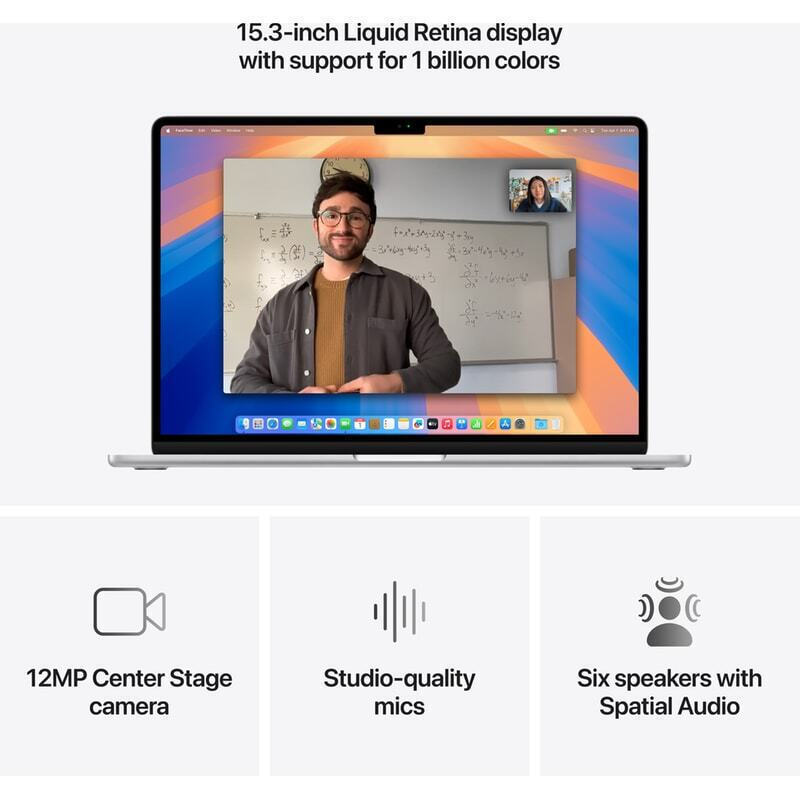 Η οθόνη Liquid Retina 15,3 ιντσών υποστηρίζει ένα δισεκατομμύριο χρώματα. Οι φωτογραφίες και τα βίντεο προβάλλονται με πλούσια αντίθεση και ευκρινείς λεπτομέρειες και το κείμενο εμφανίζεται με εξαιρετική ευκρίνεια.