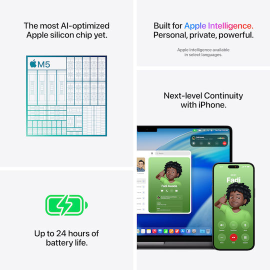 Εκτός από την ταχύτερη CPU και ενοποιημένη μνήμη, το M5 διαθέτει μια ακόμα πιο ισχυρή GPU με έναν Neural Accelerator σε κάθε πυρήνα, προσφέροντας ταχύτερες επιδόσεις AI. Για να μπορείς να διεκπεραιώνεις απαιτητικές ροές εργασίας με αδιανόητη ταχύτητα.