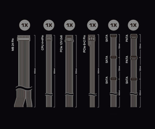 Αυτό το τροφοδοτικό είναι πλήρως ενσύρματο, πράγμα που σημαίνει ότι τα καλώδια δεν είναι αποσπώμενα. Αν και αυτό περιορίζει λίγο την ευελιξία στην εγκατάσταση, εξασφαλίζει ότι όλες οι συνδέσεις είναι σταθερές και έτοιμες για χρήση.