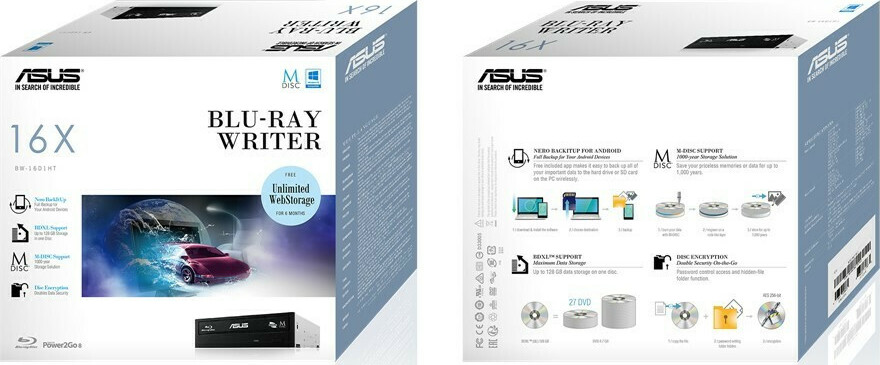 Το Asus BW-16D1HT είναι ένας ισχυρός Blu-ray writer, ο οποίος μπορεί να γράψει από 16x BD. Η συμβατότητα M-DISC σας επιτρέπει να αποθηκεύσετε τις ανεκτίμητες φωτογραφίες ή τα έγγραφά σας για περισσότερα από 1.000 χρόνια και μαζί με την υποστήριξη BDXL, η μέγιστη αποθήκευση δεδομένων είναι 128 GB σε έναν δίσκο. Κατάλληλο για όποιον επιθυμεί μια λύση συνολικής αποθήκευσης και δημιουργίας αντιγράφων ασφαλείας δεδομένων.