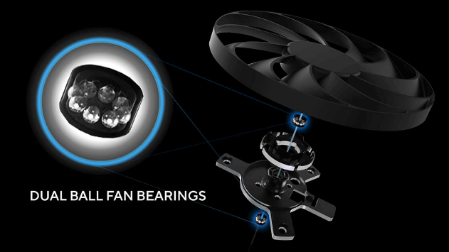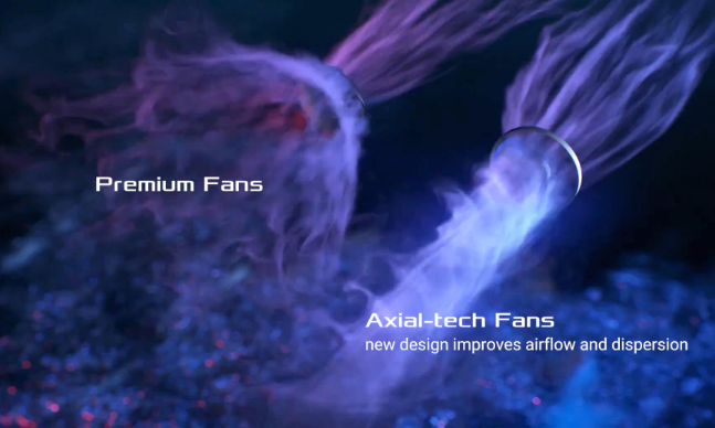 Μια προσεκτικά σχεδιασμένη διάταξη καλύμματος, ψύκτρας και σωλήνα θερμότητας επιτρέπει στους δύο ανεμιστήρες τεχνολογίας Axial να αξιοποιούν τον αερισμό στο πλαϊνό πλαίσιο του πλαισίου, προσφέροντας θερμική απόδοση που ξεπερνά το συμπαγές μέγεθος.