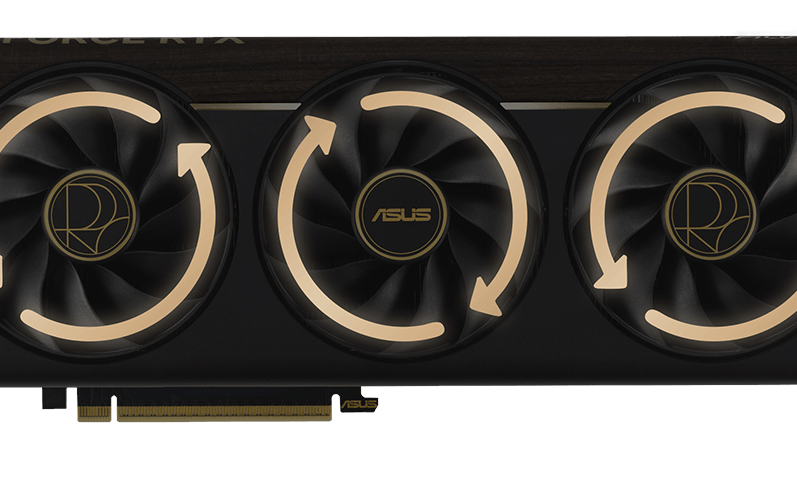 Οι δύο εξωτερικοί ανεμιστήρες περιστρέφονται αριστερόστροφα για να ελαχιστοποιήσουν τις αναταράξεις και να μεγιστοποιήσουν τη διασπορά του αέρα μέσω του ψύκτη. Και οι τρεις ανεμιστήρες σταματούν όταν η θερμοκρασία της GPU είναι κάτω από 50 °C, επιτρέποντάς σας να εκτελείτε ελαφριές δημιουργικές εργασίες σε σχετική ησυχία. Οι ανεμιστήρες ξεκινάνε ξανά όταν η θερμοκρασία υπερβαίνει τους 55 °C, ακολουθώντας μια καμπύλη ταχύτητας που εξισορροπεί την απόδοση και την ακουστική για εργασία ή παιχνίδι.