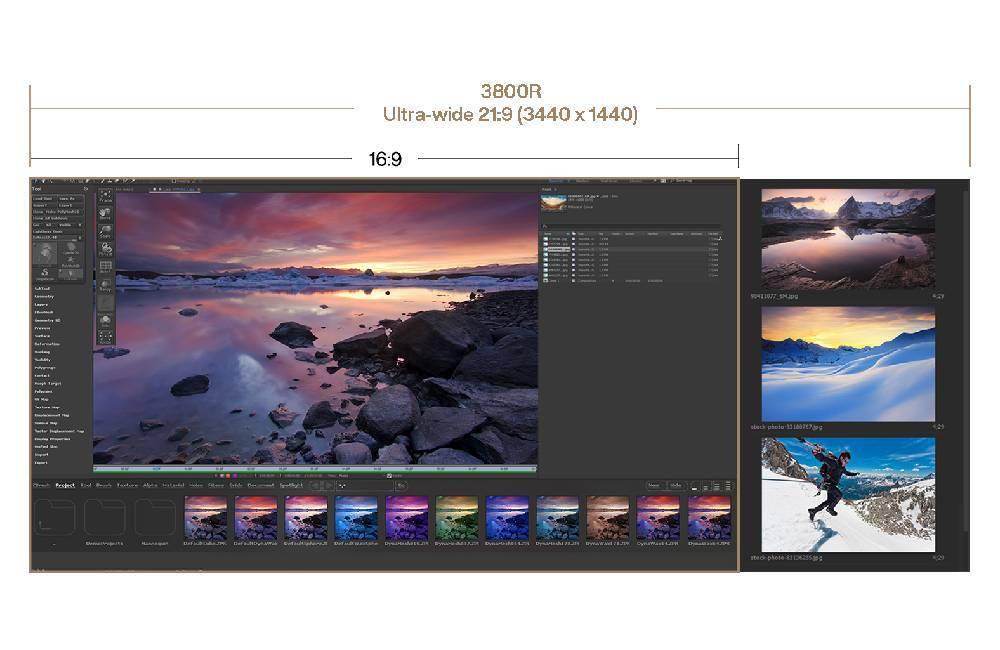 Η ultra-wide αναλογία 21:9 και η υψηλής ανάλυσης οπτική απόδοση αποτελούν απαραίτητα εργαλεία για την επεξεργασία βίντεο και το post production, καθώς προσφέρουν ευρύτερο πεδίο προβολής σε σύγκριση με μια οθόνη 16:9.
