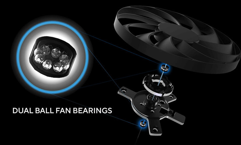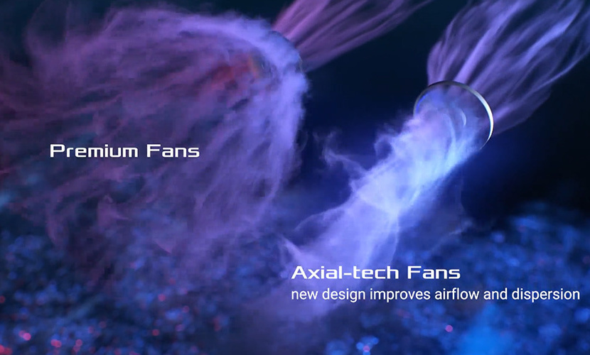 Τρεις δοκιμασμένοι ανεμιστήρες Axial-tech διαθέτουν μικρότερη πλήμνη που διευκολύνει τα μακρύτερα πτερύγια και έναν δακτύλιο φραγμού για την αύξηση της πίεσης του αέρα προς τα κάτω για χαμηλότερες θερμοκρασίες, λιγότερο θόρυβο και υψηλότερη απόδοση.