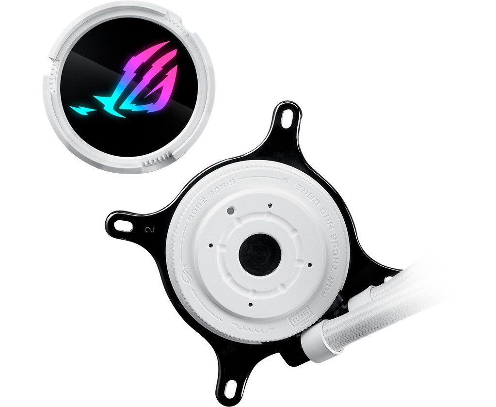 ROG Strix LC III ARGB all-in-one υγρό ψυγείο CPU με περιστρεφόμενο κατά 360° μπλοκ νερού, τη νέα αντλία Gen7 v2 της Asetek, ανεμιστήρες ROG ARGB υψηλής ποιότητας και 10+ προσαρμοσμένα εφέ φωτισμού Aura.