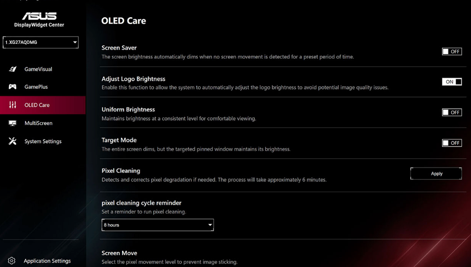 Το ASUS OLED Care παρέχει έγκαιρες υπενθυμίσεις καθαρισμού pixel, προφύλαξη οθόνης, λειτουργία μετακίνησης οθόνης και πολλά άλλα για την προστασία του πάνελ OLED και τη διασφάλιση της μακροζωίας της οθόνης.
