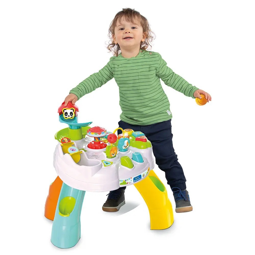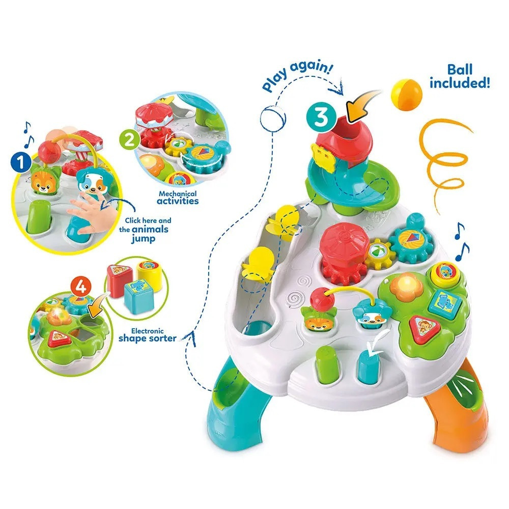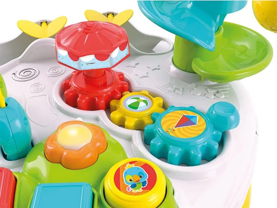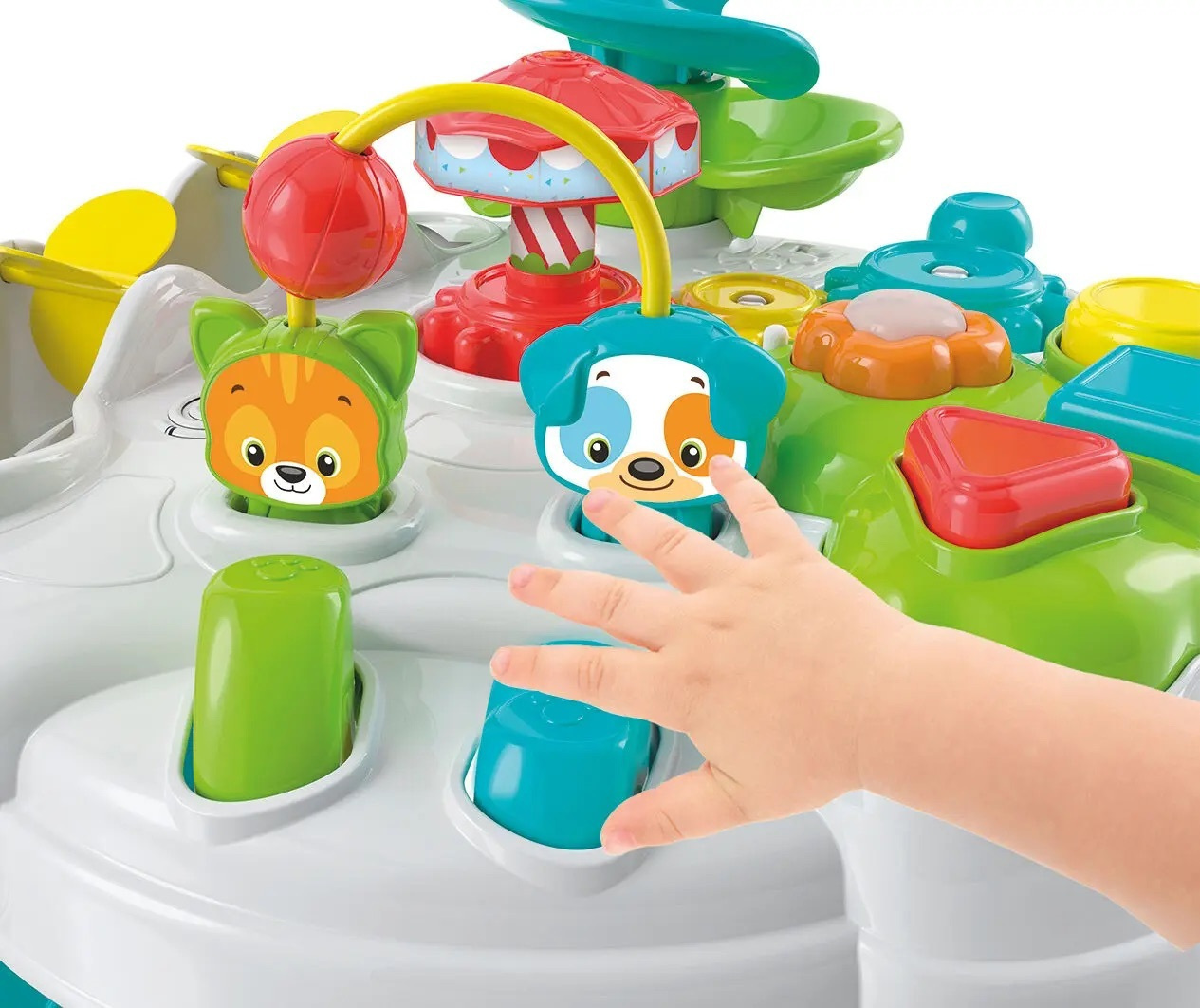 Πατώντας τα κουμπιά στο μπροστινό μέρος, ο σκύλος και η γάτα πηδούν από χαρά και παίζουν με την μπάλα. Το μπαλάκι ακολουθεί μια συναρπαστική πορεία με τσουλήθρες και περιστρεφόμενα στοιχεία, καταλήγοντας στα πόδια του τραπεζιού. Με τη βοήθεια του τραπεζιού, το παιδί στηρίζεται για να παίξει και μαθαίνει να σταθεί όρθιο, αποκτά καλύτερη ισορροπία και εξασκείται στο να σκύβει και να ξανασηκώνεται ρίχνοντας την μπαλίτσα στην τσουλήθρα και ξαναρχίζοντας από την αρχή. Το καρουζέλ περιστρέφεται χάρη στα κινούμενα γρανάζια.