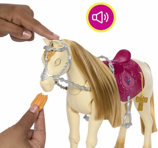 Εμπνευσμένο από τη σειρά Barbie Mysteries: The Great Horse Chase, αυτό το διαδραστικό παιχνίδι άλογο διαθέτει 20+ ήχους και πολλούς τρόπους παιχνιδιού. Τραβήξτε τις φούντες για να δείτε το άλογο να χορεύει! Πατήστε το πετράδι στη σέλα για τραγούδια εμπνευσμένα από τη σειρά. Βοηθήστε το άλογο να υποκλιθεί για ήχους ευθυμίας. Για στιγμές φροντίδας, χαϊδέψτε το κεφάλι του αλόγου και δείτε τα μάτια του να κλείνουν ενώ θα ακούτε το χλιμίντρισμά του.