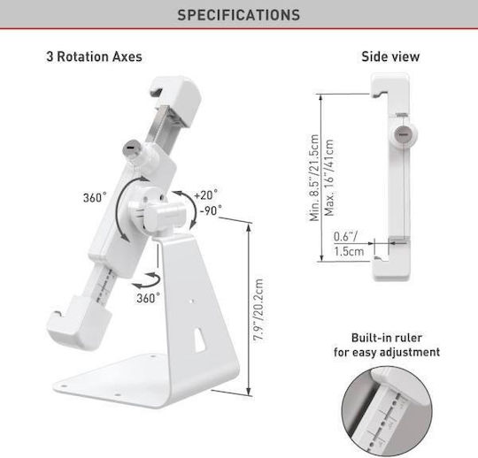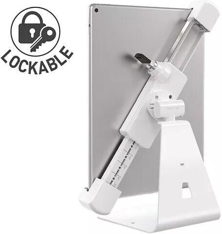 Αυτή η βάση υποστηρίζει tablets με μέγιστο πάχος συσκευής 15 mm, συμπεριλαμβανομένων των προστατευτικών θηκών. Η βάση τοποθετεί το tablet έτσι ώστε το κέντρο του να βρίσκεται περίπου 18 cm πάνω από την επιφάνεια του γραφείου, προσφέροντας εργονομικό ύψος θέασης. Περιλαμβάνει μηχανισμό ασφαλείας για την αποφυγή κλοπής, επιτρέποντας ταυτόχρονα 360° περιστροφή και ρυθμιζόμενη κλίση, διασφαλίζοντας ευέλικτη τοποθέτηση για διάφορες περιπτώσεις χρήσης.