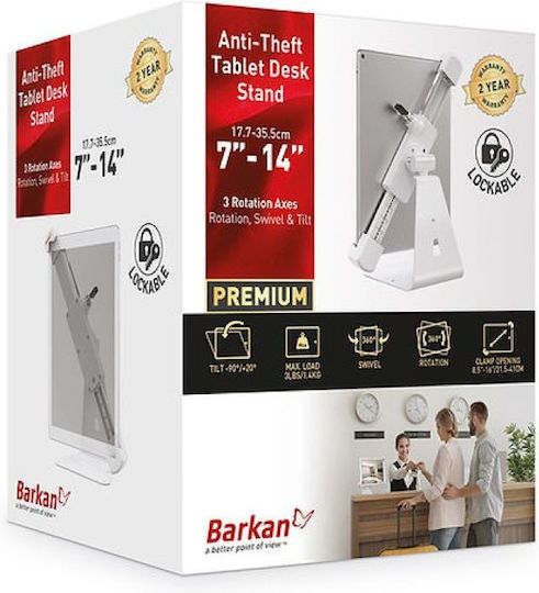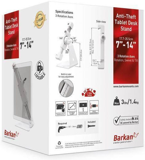 Η βάση ασφαλείας Barkan Systems T71HL είναι μία πανανθρώπινη λύση στήριξης κατά της κλοπής, σχεδιασμένη για tablets με μεγέθη οθόνης από 17.8 cm (7″) έως 35.6 cm (14″). Διαθέτει ανθεκτική λευκή φινίρισμα, κατάλληλη για επαγγελματικούς και εμπορικούς χώρους όπου απαιτείται ασφαλής προβολή tablet.