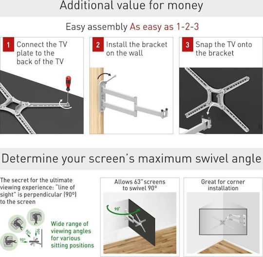 - Εξαιρετικά μακρύς τοίχος, επιτρέπει περιστροφή 90 μοιρών για τηλεοράσεις έως 63″ (πλάτος έως 55,9″/ 142 cm).