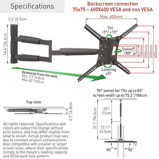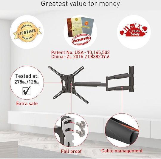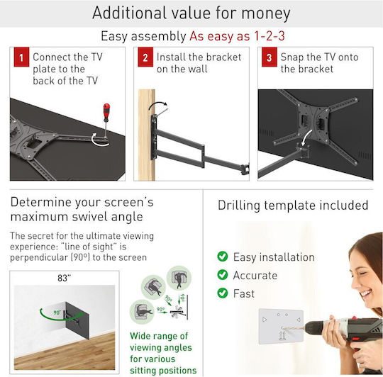 Η εγκατάσταση της είναι επιτοίχια, προσφέροντας εξοικονόμηση χώρου και ταυτόχρονα στυλ στον χώρο σου. Ο βραχίωνας επιτρέπει κινήσεις μέσα-έξω, δεξιά-αριστερά και κλίση, που σημαίνει ότι μπορείς να ρυθμίσεις την απόσταση και την γωνία της οθόνης ώστε να έχεις την καλύτερη οπτική γωνία.