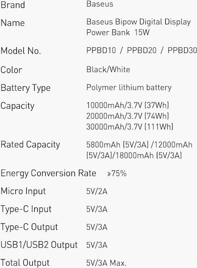 • Είσοδοι: Micro USB 10W (5V / 2A); USB-C 15W (5V / 3A)