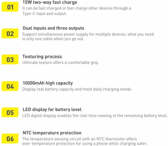 Η συσκευή είναι εξοπλισμένη με πολλαπλές θύρες, ώστε να μπορείτε να συνδέσετε περισσότερες από μία συσκευές ταυτόχρονα. Το προϊόν προσφέρει 2 θύρες εξόδου USB 15W, 1 θύρα εισόδου micro USB 10W και θύρα εισόδου / εξόδου USB-C 15W. Μπορείτε, για παράδειγμα, να τροφοδοτήσετε το tablet σας και 2 smartphone ταυτόχρονα – δεν περιμένετε πλέον να φορτιστεί η πρώτη συσκευή πριν συνδέσετε την επόμενη.
