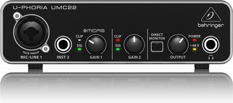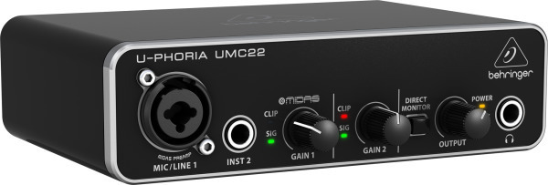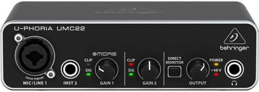 Επαγγελματική κάρτα ήχου Behringer U-Phoria UMC22 με 2 εισόδους και 2 εξόδους. Διαθέτει προενισχυτή μικροφώνου, είσοδο για μουσικό όργανο και λειτουργία direct monitor.