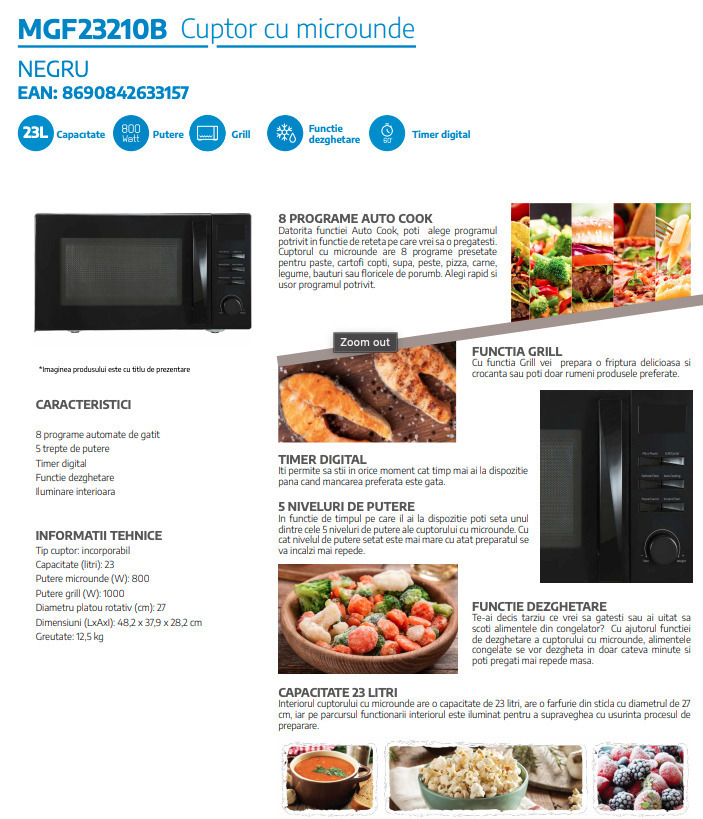 - Αυτόματα προγράμματα μαγειρικής: Χρησιμοποιήστε το φούρνο μικροκυμάτων για θέρμανση, απόψυξη και μαγείρεμα πολλών συνταγών, όπως λαχανικά, κόκκινο κρέας, ποπ κορν, ζυμαρικά, ψητές πατάτες, σούπες, ψάρι και πίτσα.