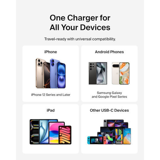 Ο φορτιστής διαθέτει απαλό και λειτουργικό σχεδιασμό, ιδανικός για καθημερινή χρήση. Είναι εξοπλισμένος με αποσπώμενο καλώδιο USB-C και είναι συμβατός με ποικιλία συσκευών, ιδίως smartphones, παρέχοντας ταχύτατη φόρτιση μέσω της τεχνολογίας Power Delivery.