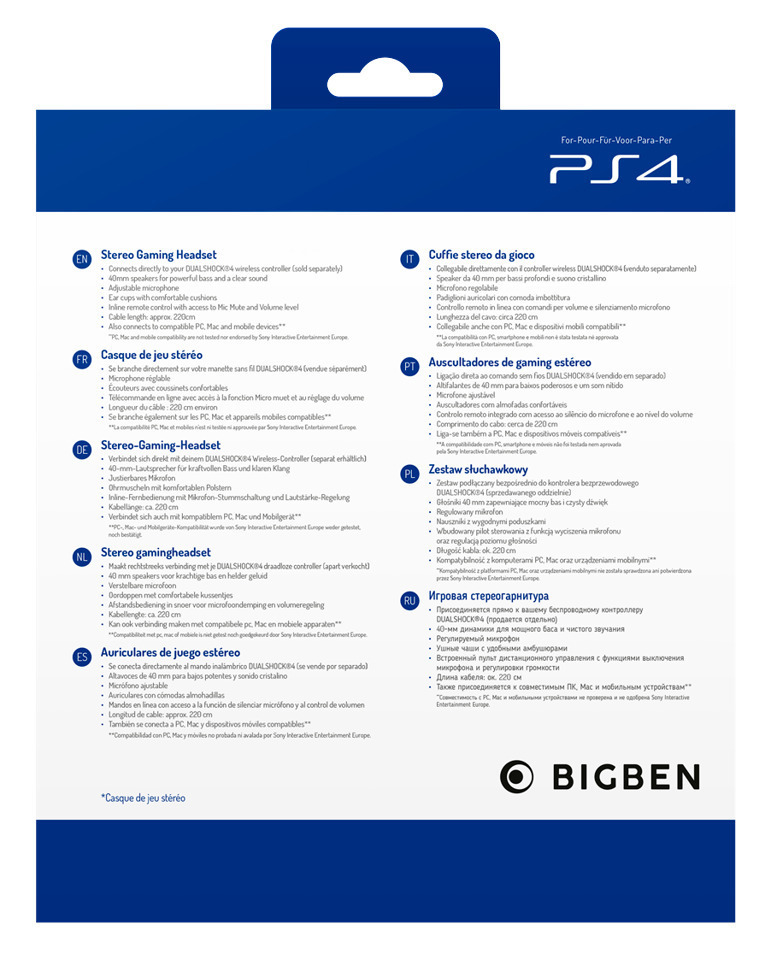 Τα gaming headset V.3 με στερεοφωνικό ήχο από την Big Ben είναι κατασκευασμένα για να λειτουργούν με την κονσόλα PS4 καθώς διαθέτουν επίσημη άδεια από την Sony (Official Licensed). Επιπλέον, είναι συμβατά με PC, smartphones και tablets μέσω βύσματος 3,5 χιλ. Επίσης, έχουν μεγάλα ακουστικά 40mm, δυνατότητα προσαρμογής ύψους, εύκαμπτο και ρυθμιζόμενο μικρόφωνο.