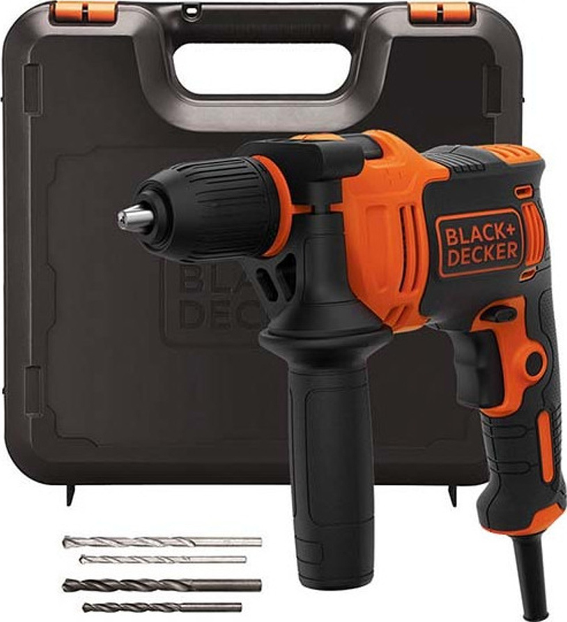 Δράπανο κρουστικό Black & Decker με ισχύ 710W και ταχύτητα έως 2800rpm, παρέχοντας 47600 bpm κρούσεις. Το τσοκ έχει διάμετρο 13mm και περιλαμβάνει πλαϊνή λαβή και 4 τρυπάνια.